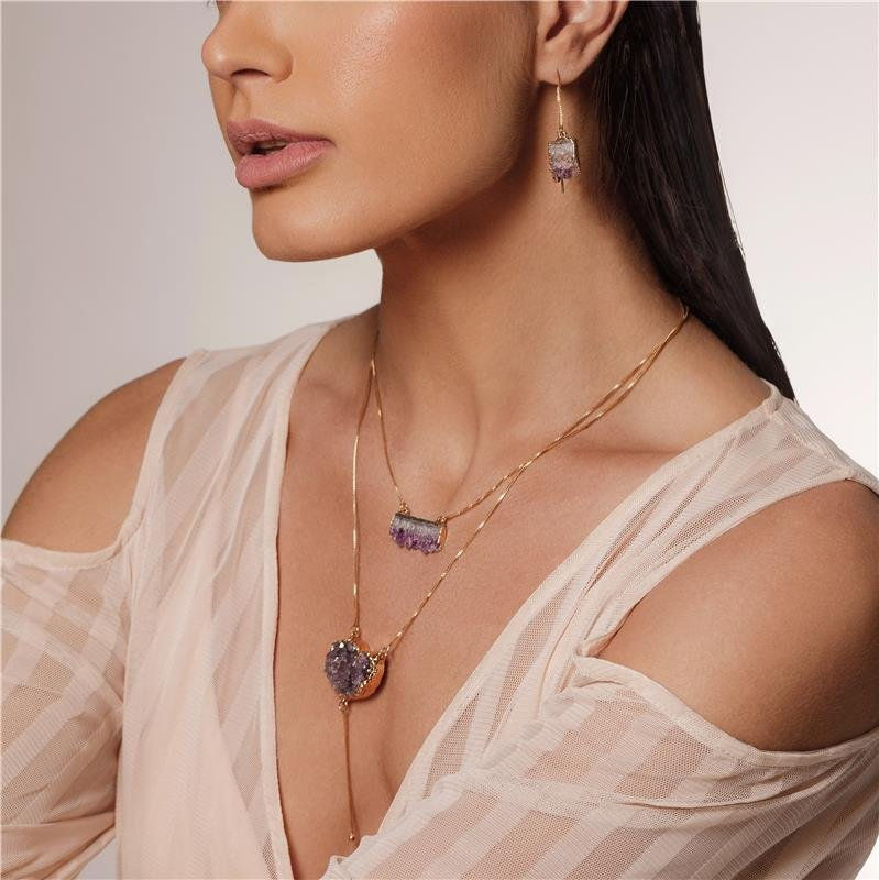 COLEÇÃO RARIDADE. Brinco com pedra natural, extraida do interior de uma ametista, possuindo detalhes em drusa, com formato retangular e tamanhos variados, as pedras variam de 1,5cm a 2cm. tornando-se assim uma peça única. Com um design moderno ele não possui tarraxa, seu pino possui corrente veneziana de 5cm, diversificando assim o seu uso. Altura total aproximada do brinco: 9,5cm