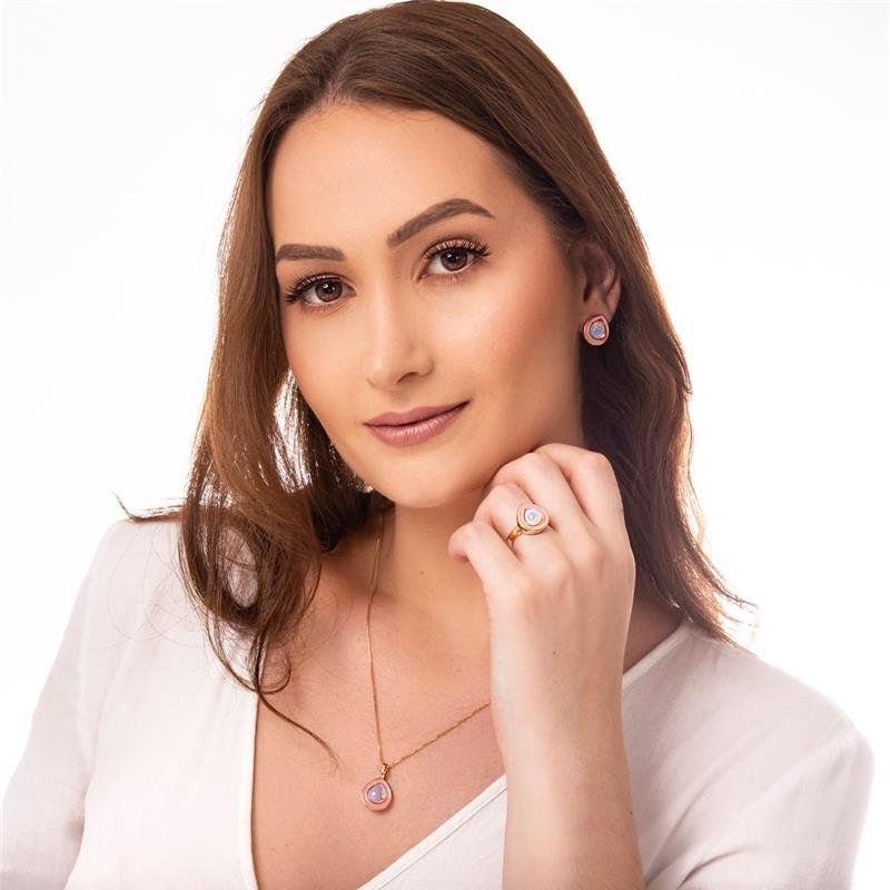 COLEÇÃO HAPPY. Conjunto é composto por brinco com pedra cabochão, no formato de gota 8,65mm. Acompanha pingente de mesma pedra. Corrente veneziana de 43cm + 7cm de extensor. Possui detalhes esmaltados em vermelho. Altura total do brinco: 1,6cm. Altura total do pingente: 2,3cm.