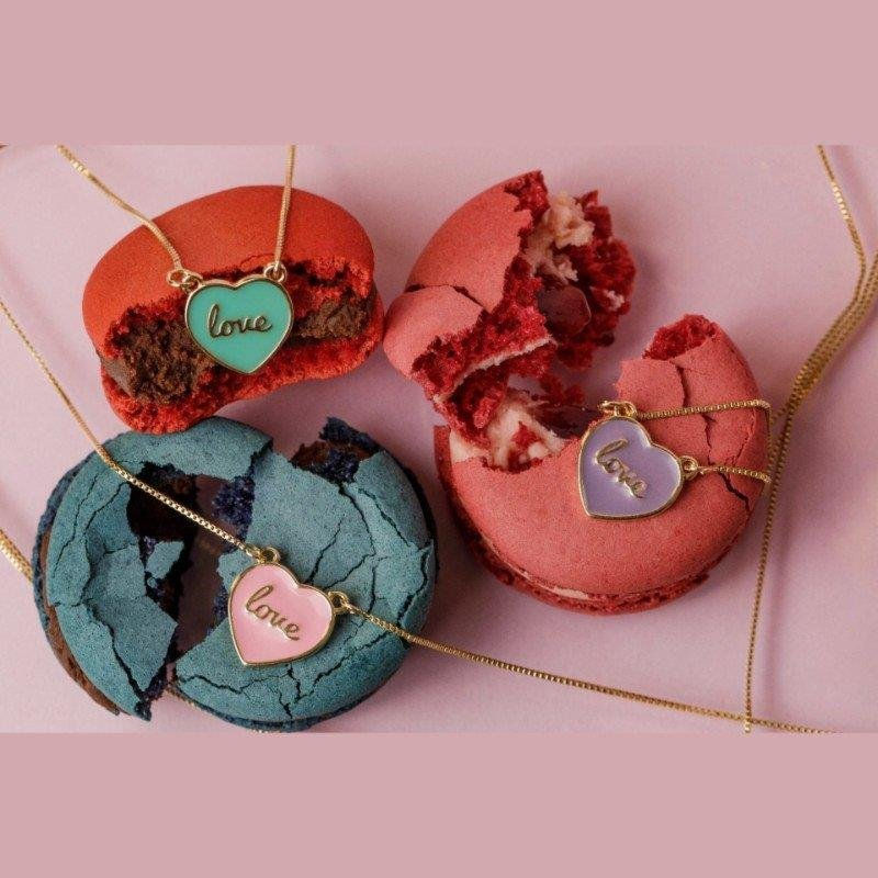 COLEÇÃO HAPPY. Pingente com pedra em formato de coração 12x13mm com medalha escrito ''LOVE''. Acompanha corrente veneziana de 92cm no total, possibilitando usá-la dupla no pescoço. Possui detalhes esmaltados em verde.