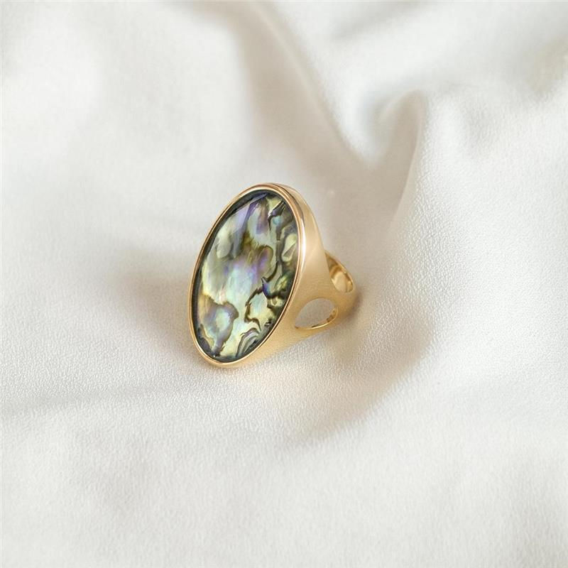 COLEÇÃO CONCHAS. Anel com pedra de concha sobreposta por um cristal facetado, no formato oval 20x30mm. Possui detalhes vazados em sua lateral.