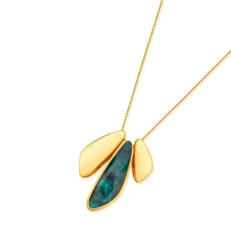 COLEÇÃO ESMERALDA. Tamanho do pingente com pedra: 3,5cm Tamanho dos pingentes sem pedra: 2cm e 2,8cm. Tamanho do colar: 60cm + 7cm de extensor. Tamanho da pedra: escaleno facetado 9x32mm.