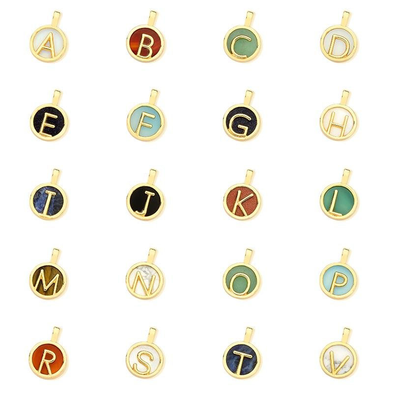 COLEÇÃO LETRAS. Combo composto pelas 20 letras disponíveis em nossos catálogos. Com cores variadas. Pingentes sem corrente com pedra chapa em formato redondo de 15mm. Altura total do pingente: 2,2cm.
