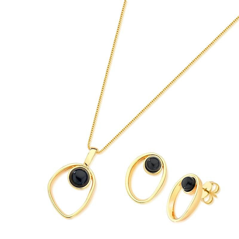 LINHA BÁSICA. Conjunto é composto por brinco com pedra cabochão, no formato redondo de 6,5mm, acompanha pingente com pedra cabochão no formato redondo de 8mm. Corrente Veneziana de 43cm + 7cm de extensor. Altura total do brinco: 2,4cm. Altura total do pingente: 3,3cm.