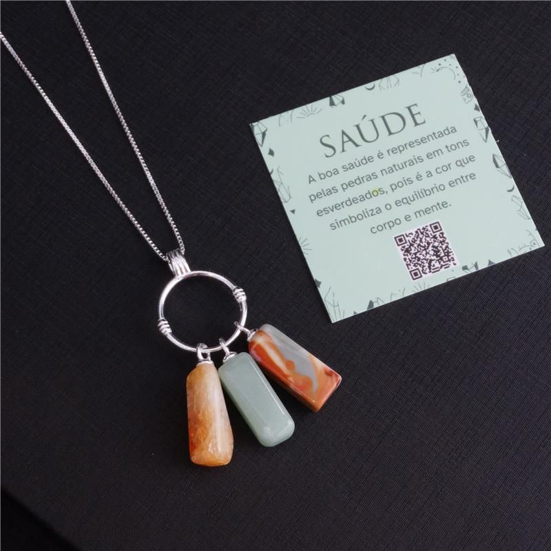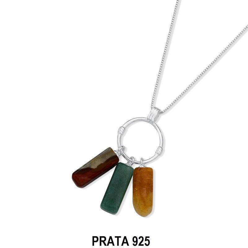 COLEÇÃO PRATA 925. Pingente com três pedras naturais de cascalhos polidos de tamanhos e formatos variados. Acompanha corrente veneziana 60cm. Talismã da Saúde: A boa saúde é representada pelas pedras naturais em tons esverdeados, pois é a cor que simboliza o equilíbrio entre corpo e mente.