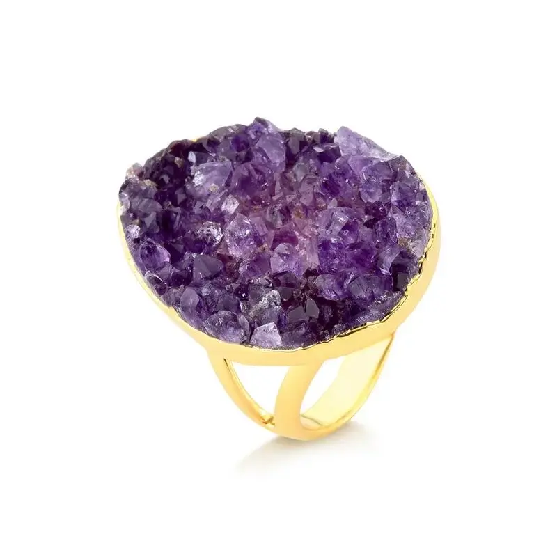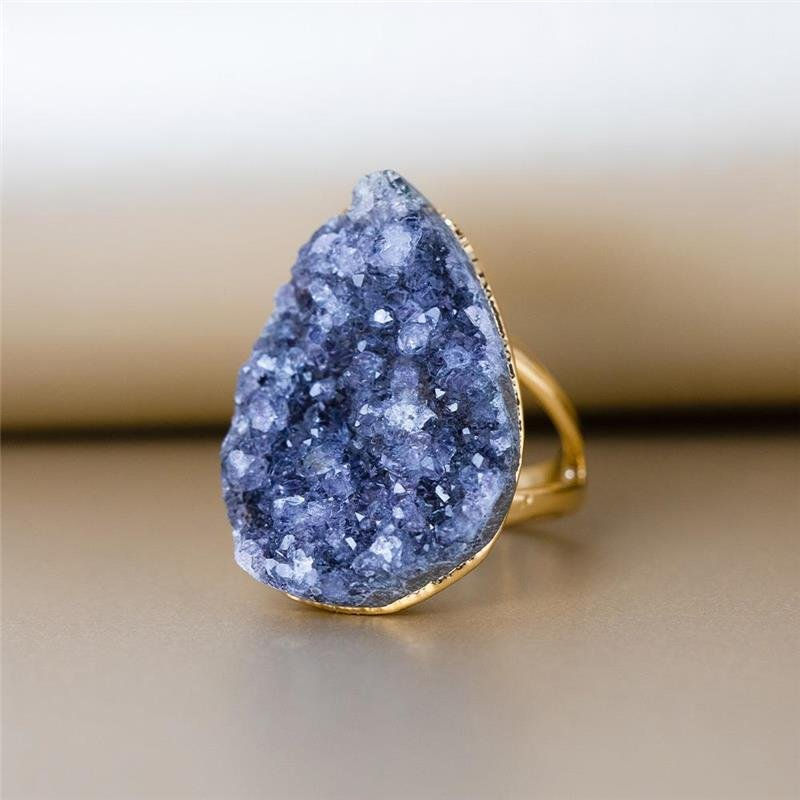 COLEÇÃO RARIDADE. Anel com pedra natural em formato irregular de drusa. Por se tratar de pedras naturais, cada uma possui seu brilho e beleza, tornando-se uma peça única e exclusiva. As pedras variam de 2cm a 2,5cm.