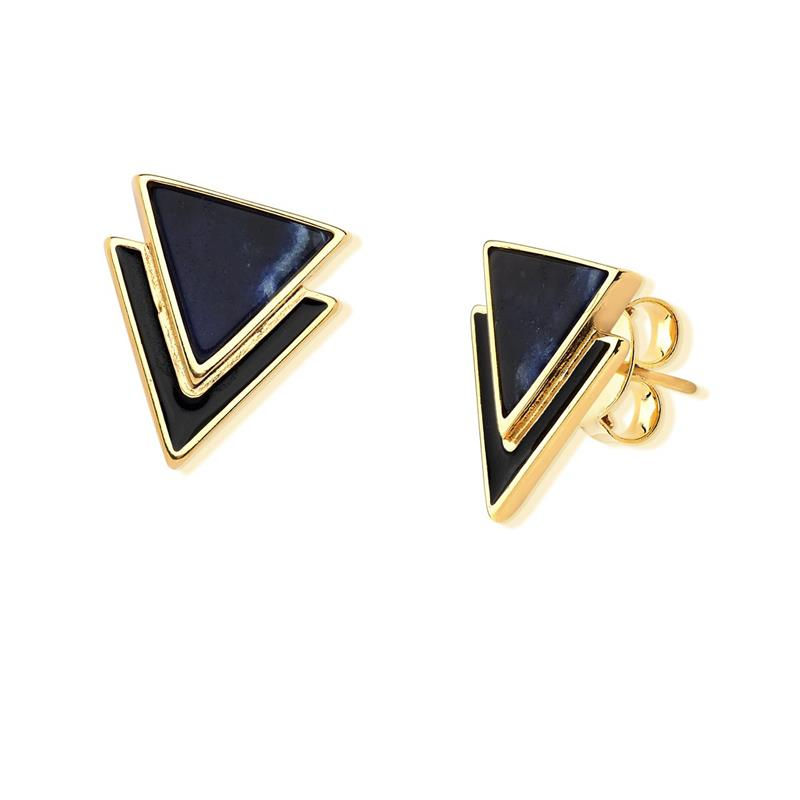 COLEÇÃO ÚNICA, Brinco com detalhes esmaltados, Pedra chapa triângulo de 15MM, 2,5 CM de altura