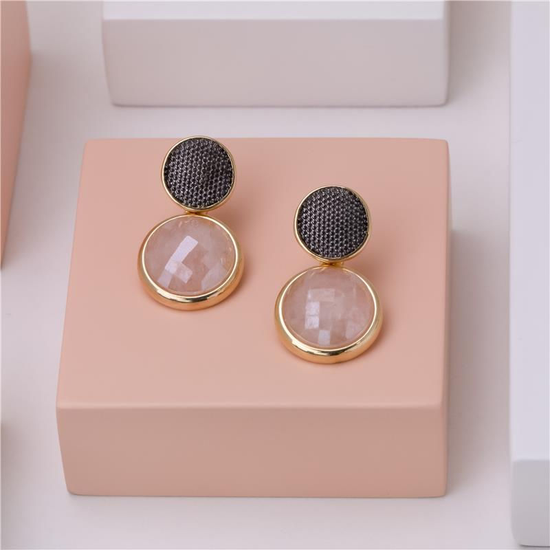 COLEÇÃO FACETADA PEROLADA. Brinco com pedra natural facetada, com efeito perolado, no formato redondo de 12mm. Possui detalhes com aplicação de caneta de ródio negro. Altura total da peça: 2,7cm.