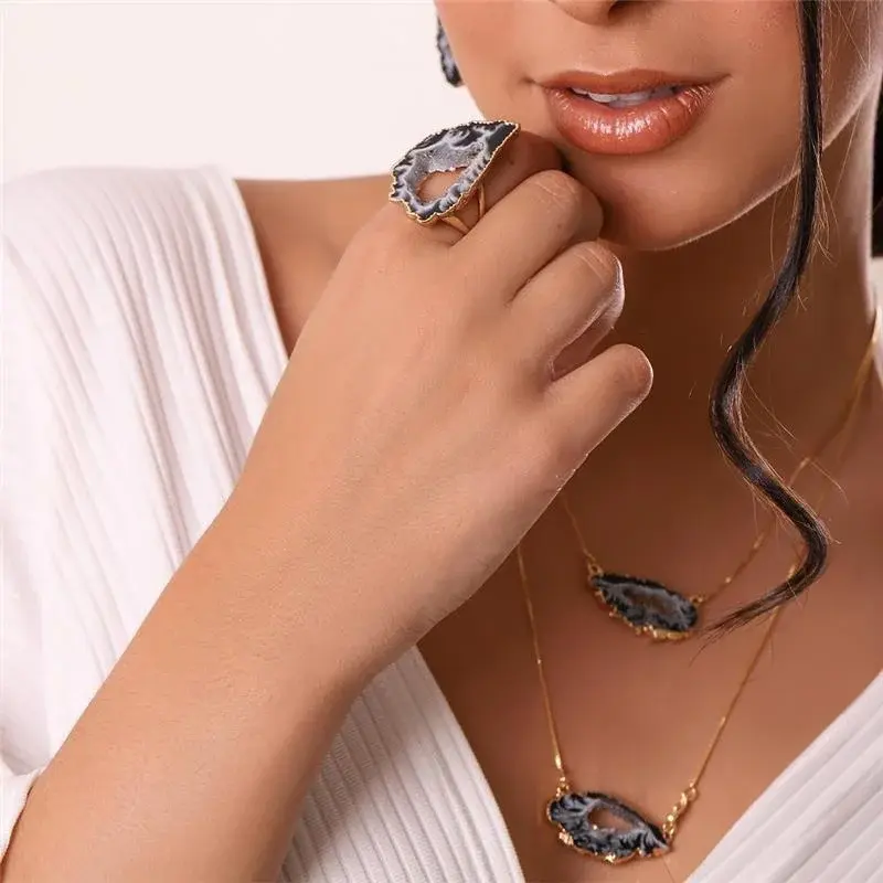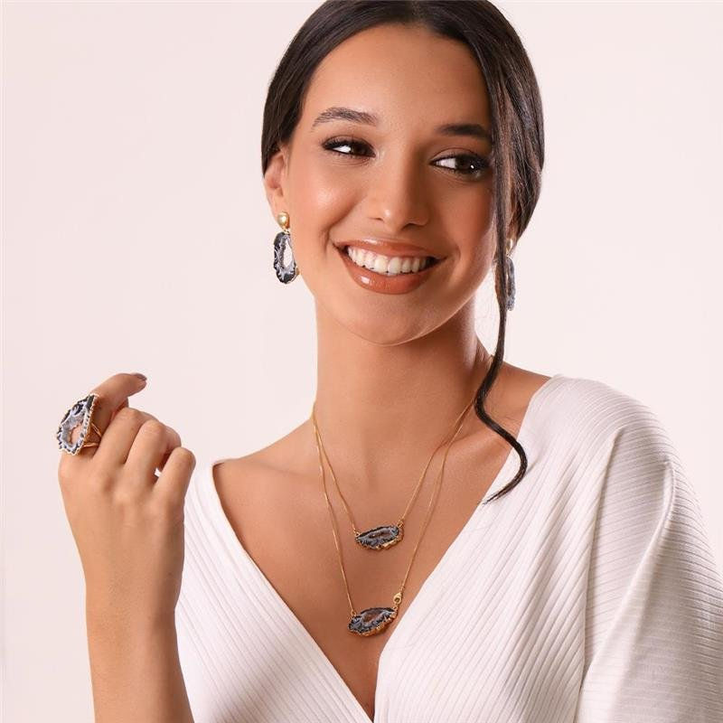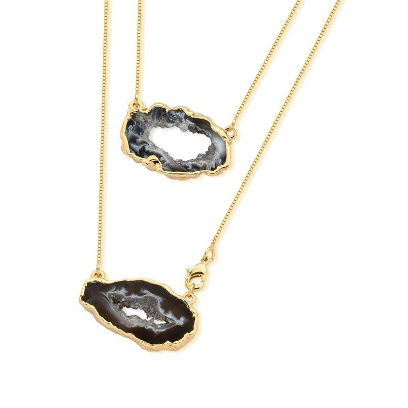 COLEÇÃO RARIDADE. Colar duas alturas, de duas pedras natural de geodo, extraida do interior de uma ágata, possuindo detalhes em drusa, com formato e tamanhos variados, tornando-se assim uma peça única. As pedras variam de 2,5cm a 3,5cm. Acompanha corrente veneziana de 45cm cada lado. Observação sobre as cores: por se tratar de pedras naturais, os geodos possuem variações, que vão desde o mais claro ao mais escuro. Caso deseje algum tom específico, nos detalhe na observação do produto ou do pedido!