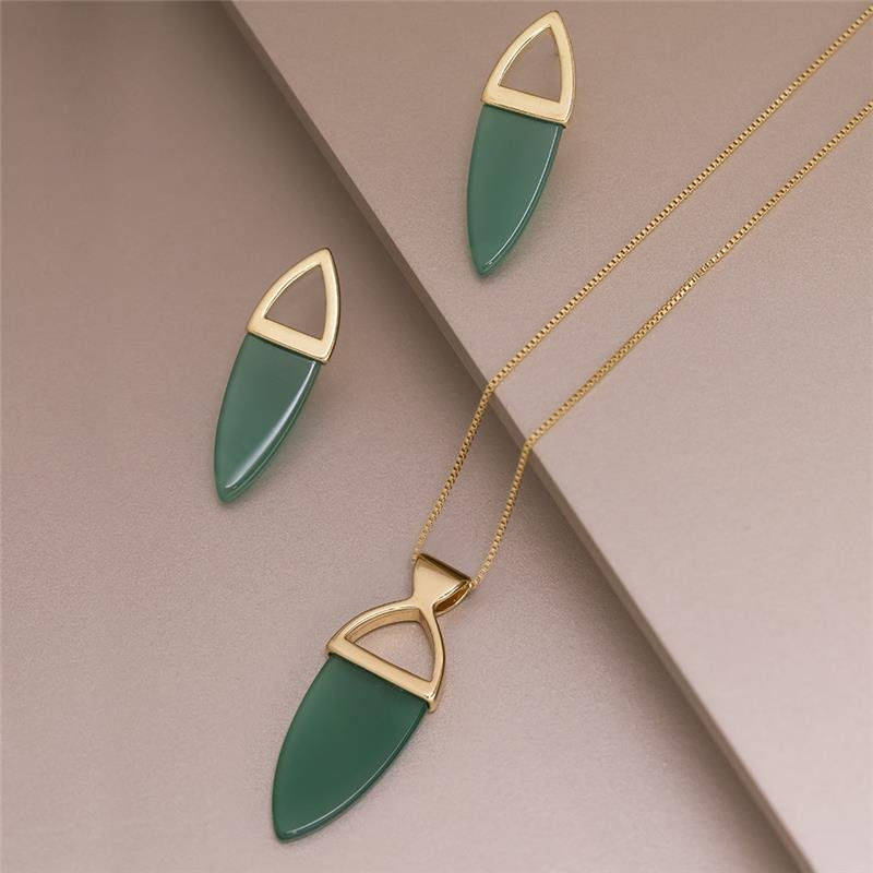 COLEÇÃO GEOMÉTRICA. O conjunto é composto por brinco com pedra de chapa em formato de lança 10X22MM. Pingente com pedra de chapa em formato de lança maior 14X25MM. Corrente venezina de 43 cm + 7 cm de extensor. Altura total do brinco: 3,5cm. Altuta total do pingente: 4,2cm.