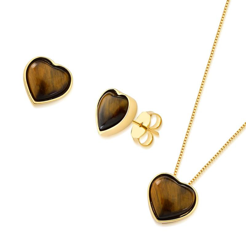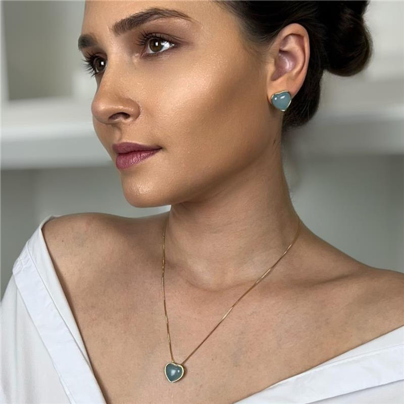 COLEÇÃO CORAÇÃO. Conjunto é composto por brinco com pedra cabochão, no formato de coração 12x13mm, acompanha pingente de mesma pedra. Corrente Veneziana de 43cm + 7cm de extensor. Altura total do brinco: 1,5cm. Altura total do pingente: 1,5cm.