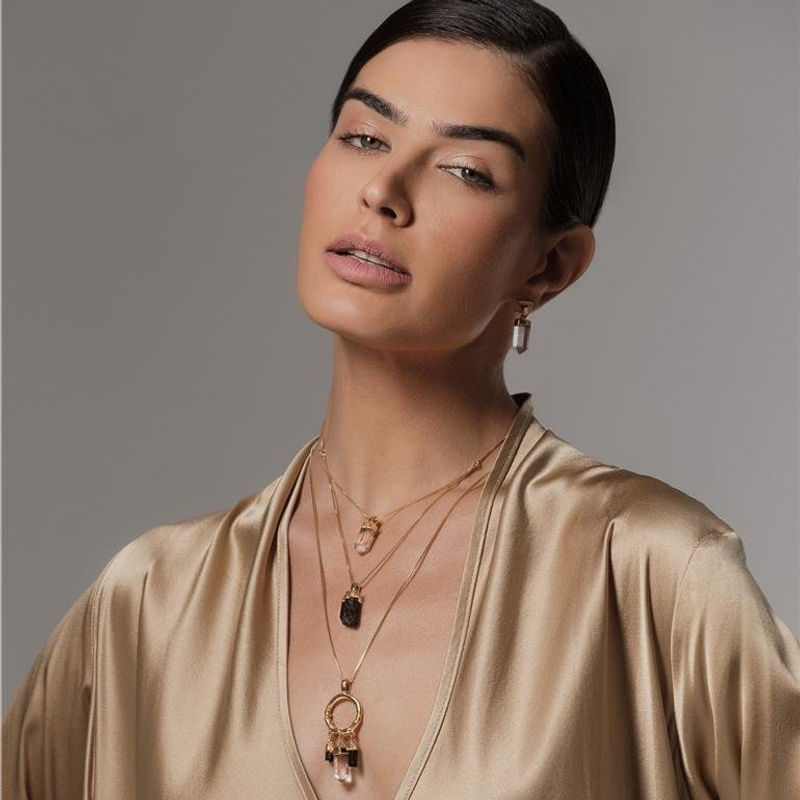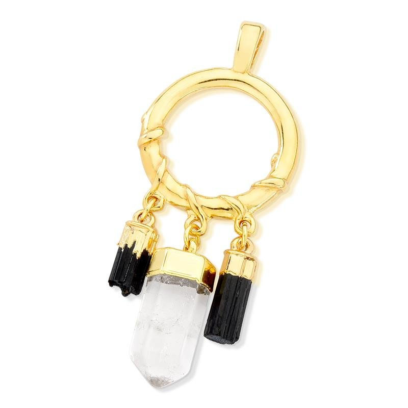 COLEÇÃO RARIDADE. Pingente avulso, sem corrente, com três pedras, sendo duas de turmalina negra bruta e uma ponta de cristal, com tamanhos e formatos variados. Altura total aproximada do pingente: 6cm.