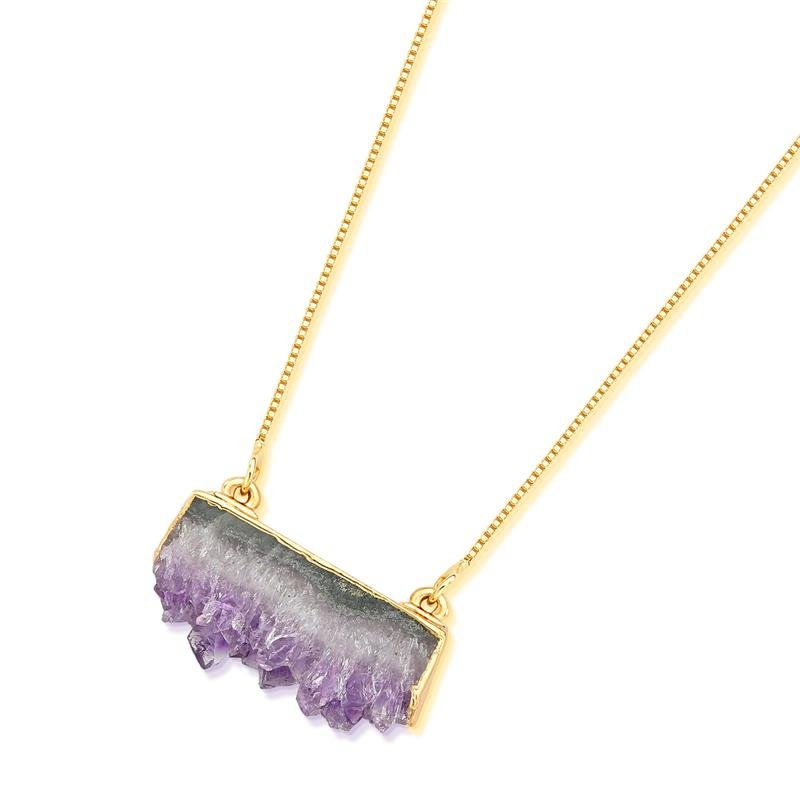 COLEÇÃO RARIDADE. Colar com pedra natural, extraida do interior de uma ametista, possuindo detalhes em drusa, com formato retangular e tamanhos variados, tornando-se assim uma peça única. Acompanha corrente veneziana de 40cm + 7cm de extensor, as pedras variam de 2,5cm a 3,5cm.