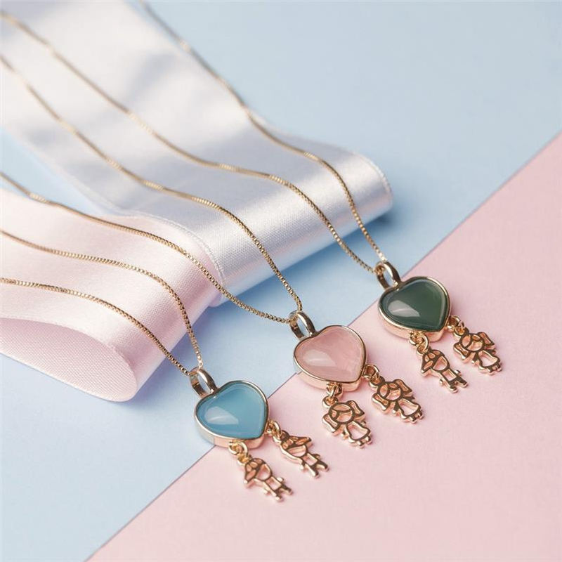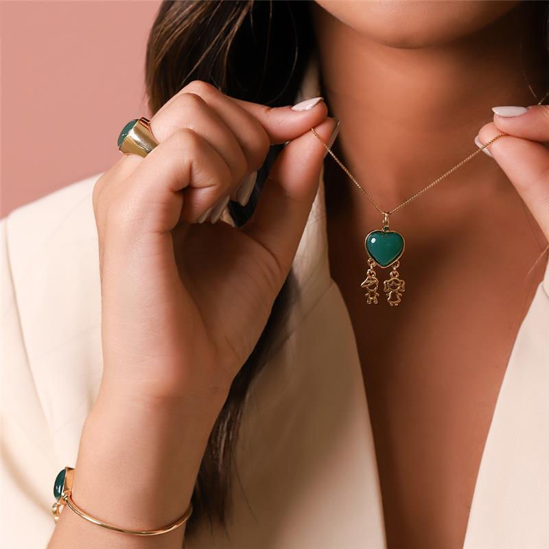 LINHA BÁSICA. Pingente com pedra cabochão em formato de coração 12x13mm. Possui 2 pingentes adicionais com um menino e uma menina. Acompanha corrente Veneziana de 43cm + 7cm de extensor. Altura do pingente: 3,5cm.