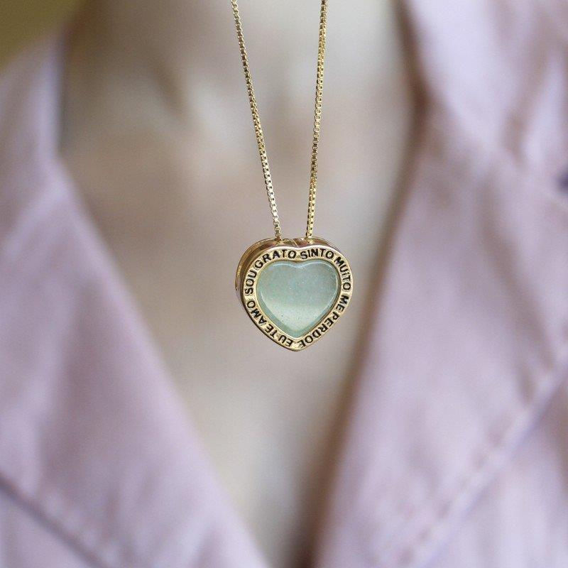COLEÇÃO ZEN. Pingente com pedra em chapa com formato de coração 12x13mm. Possui os dizeres: ''SOU GRATO, SINTO MUITO, ME PERDOE, EU TE AMO.'' Altura total do pingente: 1,9cm.