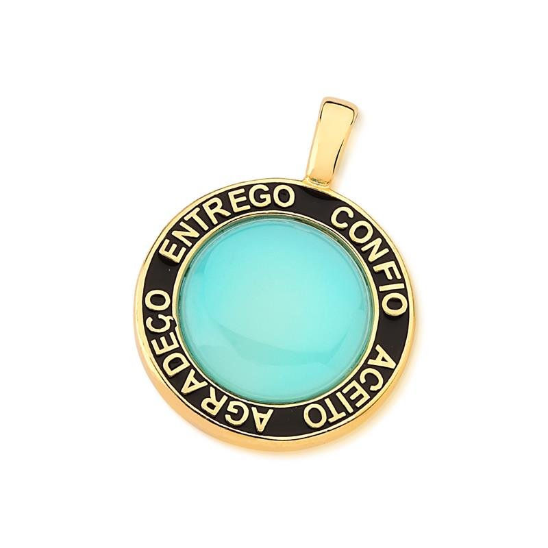 COLEÇÃO ZEN. Pingente com pedra cabochão no formato redondo de 17mm. Possui os dizeres ''ENTREGO, CONFIO, ACEITO, AGRADEÇO''. Um mantra muito usado na prática da Yoga. Altura total do pingente: 3,4cm.