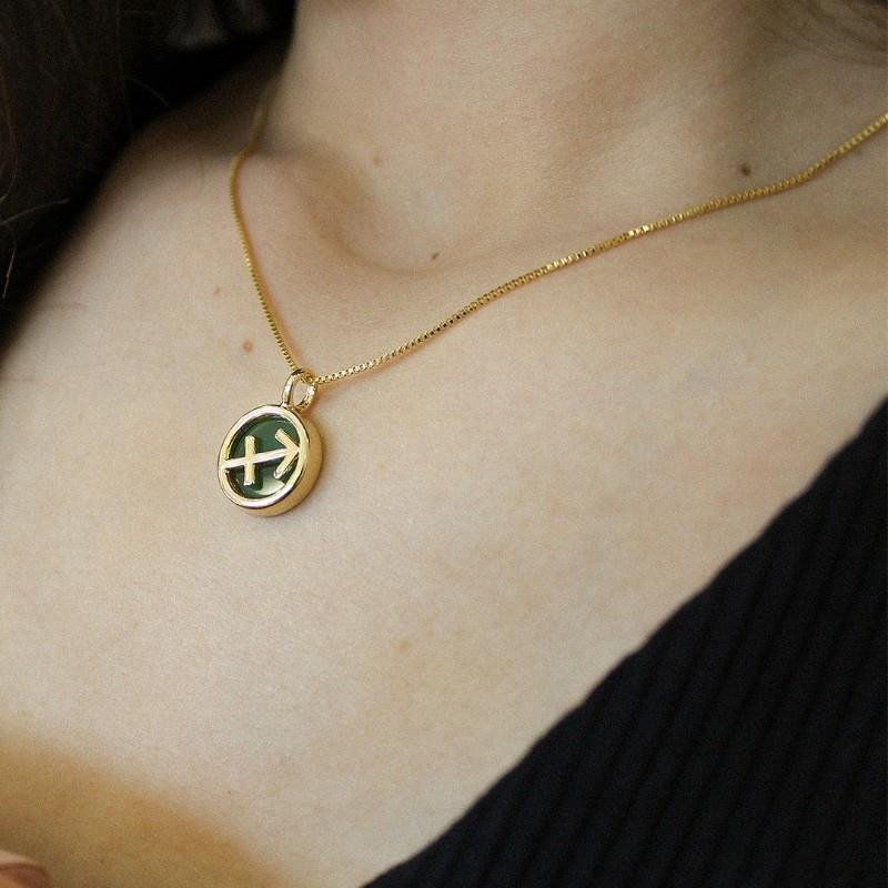 COLEÇÃO SIGNOS, Pingente do signo de Sagitário com pedra chapa no formato redondo de 12mm. Corrente Veneziana de 43cm + 7cm de extensor. Tamanho do pingente: 2cm.